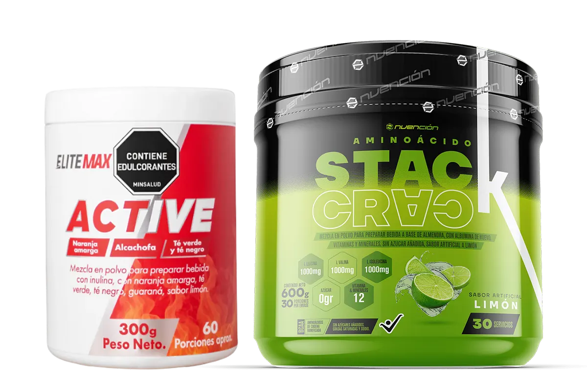 Este combo está compuesto por ACTIVE, el cual tiene ingredientes como Cafeína, té verde, te negro, naranja amarga, guaraná y citrulina. El otro producto es el STAC CRACK, con una concentración de 1.1.1 de BCCAs, a base de almendra y albúmina de huevo y libre de azúcares añadidos, sodio y grasas saturadas. Ideal para acelerar ese proceso que buscas.