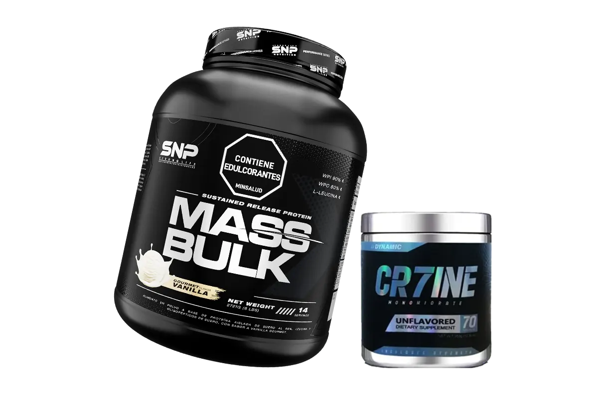 Este combo está compuesto por una proteína alta en calorías y con una alta concentración en proteína. Y CR7, una creatina de 5 gramos de concentración.